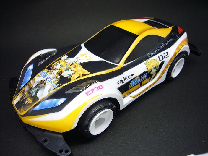 まずはミク四駆。リンレン仕様のデカールが付いてきたおかげで思わず買っちゃいましたよ。予定外の散財その一。